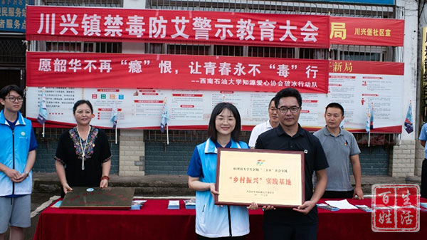 在凉山州州府西昌市,西南石大破冰行动队联合西昌市川兴镇在川兴堡社区开展禁毒防艾警示教育大会暨“乡村振兴”实践基地授牌仪式。川兴镇党委书记孙歆、镇长方浩和全镇干部、13个村社的村社干部以及部分重点人群家属100余人参会并见证“乡村振兴”实践基地挂牌。石大破冰行动队指导老师文雪在禁毒警示教育大会上,向与会人员讲解了常见毒品和新型毒品的种类、毒品的危害及识别方法。实践队员向与会者发放了禁毒防艾宣传资料、禁毒纪念品。川兴镇政府还与西南石油大学达成了社会实践基地共建协议:充分发挥校地双方合作的优势,进一步推动和促进川兴镇的社会经济发展、强化和提高在校大学生的社会实践能力。会议结束后,实践队员跟随当地工作人员,前往重点人群家中进行走访、慰问和禁毒防艾知识的宣传。