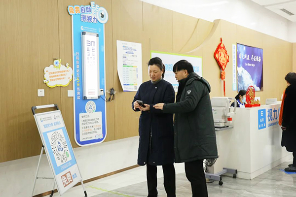慰问期间,在段俊国院长、杨思进执行院长的陪同下,顾晓玲部长一行来到医院门诊大厅,重点了解医院建设发展情况和实地体验了医院自检自测视力研发智能系统。