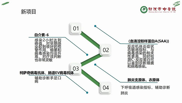 ◆开展白介素-6、柯萨奇病毒抗体、肠道EV病毒抗体、血清淀粉样蛋白A(SAA)肺炎支原体、衣原体等多项新项目
