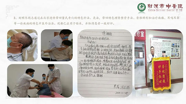 ◆刘明冬同志通过在北京进修带回董氏奇穴的特色针法、灸法,特色理脊整骨手法、脊椎矫形和治疗面瘫、耳鸣耳聋等一些疾病的特色中医外治法,现都已应用于临床,并取得患者一致好评