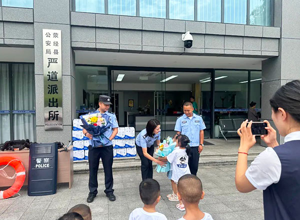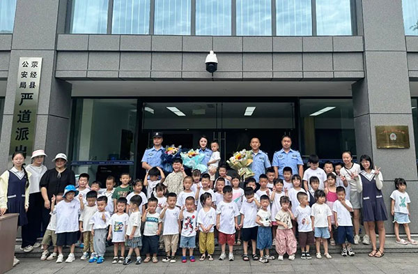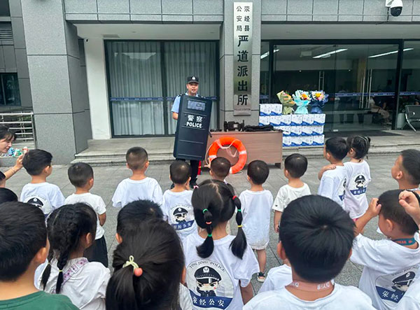 在老师的带领下,小朋友们怀着好奇和崇敬的心情走进了严道派出所。民警叔叔阿姨们热情地接待了孩子们,并带领他们参观了各个功能区域。民警向小朋友们展示了警用装备,如盾牌、警棍、手铐等,并详细介绍了它们的用途和使用方法。孩子们还兴奋地戴上了警帽,体验了一把当“小警察”的感觉。民警通过生动有趣的故事和图片,为孩子们讲解了交通安全、防拐骗、防火等安全知识,提醒他们要时刻保护自己,遇到危险及时求助警察。参观结束后,孩子们为警察叔叔阿姨送上了精美的鲜花,表达了对他们的敬意和感谢。