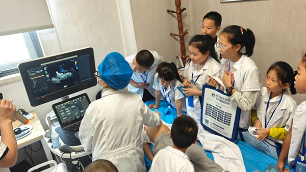 超声科内,孩子们围着超声设备仪器,眼睛里闪烁着好奇。钱均键老师耐心地介绍着仪器的工作以及成像原理,让小朋友们连连称奇!
