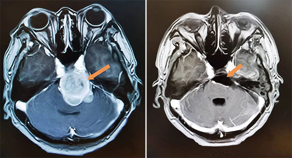 图为:手术前(左图)和手术后(右图),肿瘤全切除,脑干受压解除。