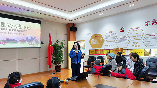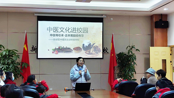 为传承和弘扬中医药文化,让更多人走近中医,了解、感受中医的魅力,促进中医药文化传承创新发展,也为了不断培育青少年文化自信和健康素养,让学生们通过近距离体验中医药文化,感受中医药文化的独特魅力。2023年12月12日上午,新都区中医医院副院长黄坪、安全保卫处处长唐怀安带领医护人员以及成都医学院2020级中医本科易起来团队走进新都区特殊教育学校(文中简称:新都特校),开展“中医导引术-古本易筋经传习”主题活动,慧4.1班和慧4.2班的全体师生、家长参与此次活动。
