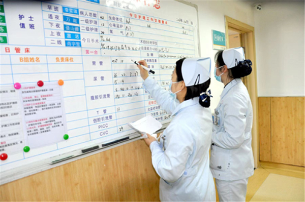 图为:认真填写护士值班记录。