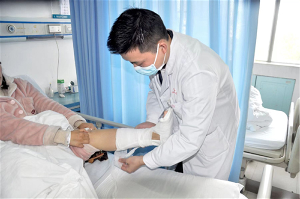 图为:骨科医生为患者的右腿换药。