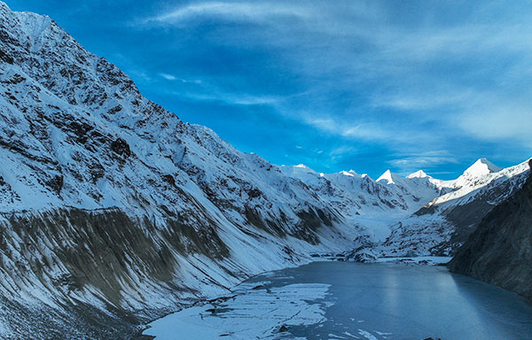 祥格拉冰川,又称普玉冰川,位于西藏昌都地区的边坝县境内,紧邻边坝最著名的三色湖景区,是一座人迹罕至的小众冰川。祥格拉冰川景观奇特,在隐藏的云雾间,雪山蔓延到冰湖中,宛若一条冰雪巨龙,散发出磅礴之势。在这里你还会看到,层林渐染,白雪初上,俯瞰冰原旷野,感受别样的祥格拉冰川冬日风情。