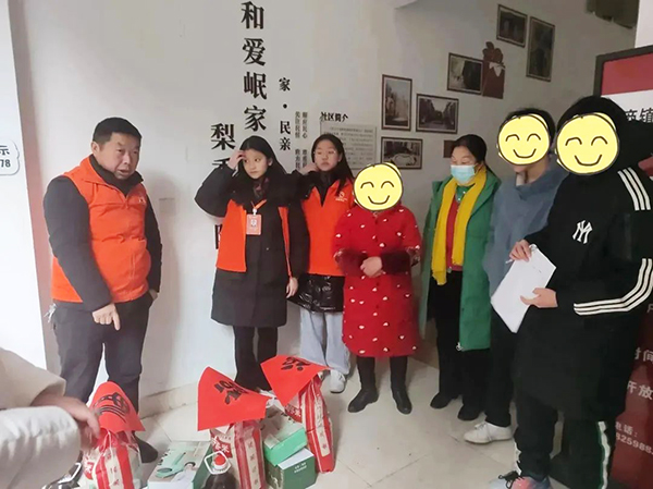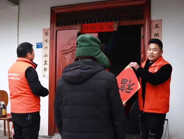 “周大爷,家里可还好?最近温度降得快,防寒衣服、被子够用吗?这是春联,我帮您贴到门上。”